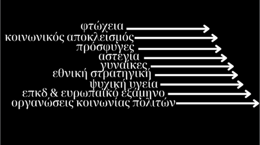 - Ενδυνάμωση των ειδικών: θεσμοθέτηση της ισότιμης συμμετοχής των ανθρώπων που πλήττονται από φτώχεια, σεβασμός των δικαιωμάτων τους μακριά από αποκλεισμούς και διακρίσεις.